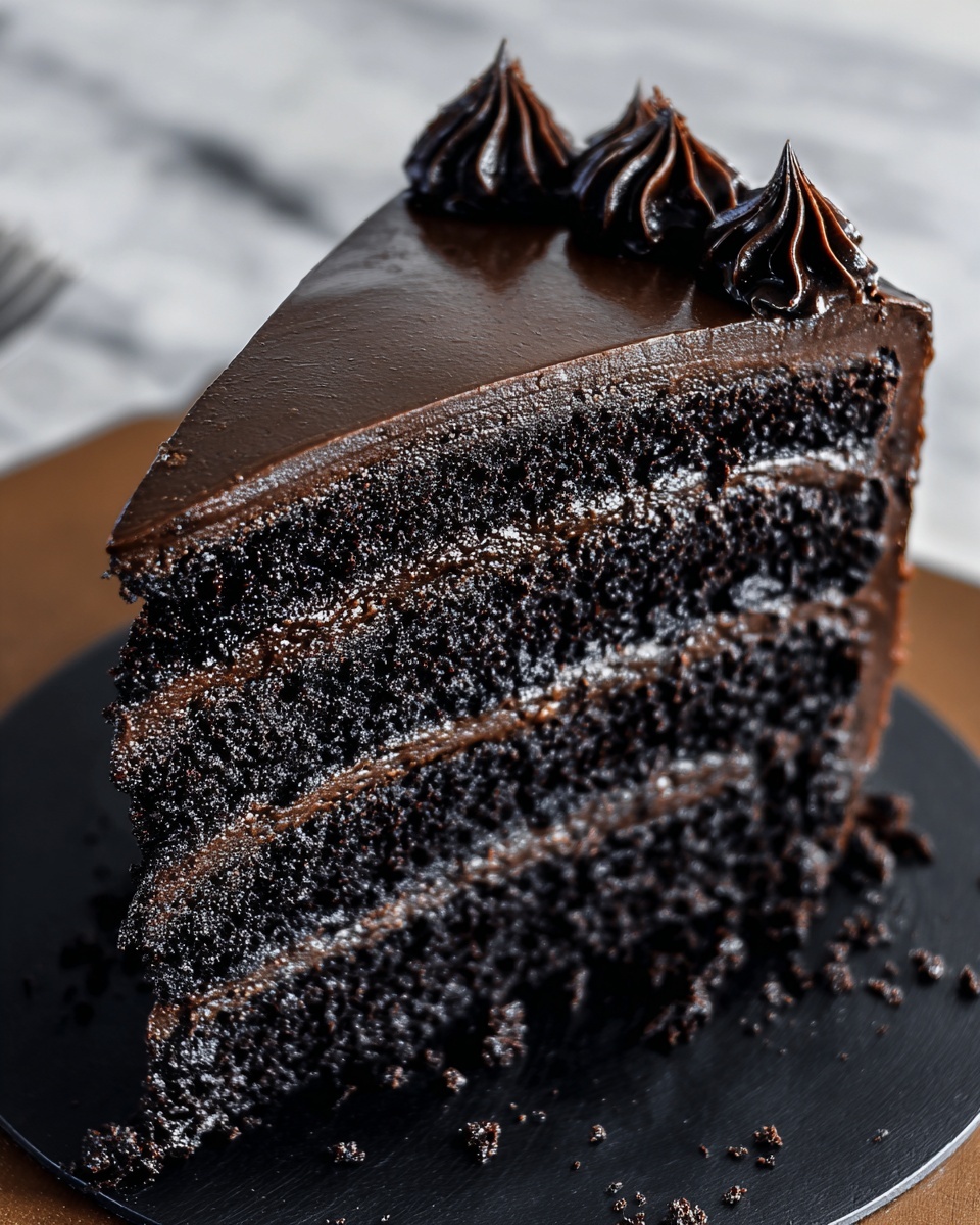 Carefully slice each cooled cake layer horizontally to create four layers total. Spread a generous amount of black cocoa buttercream between each layer for richness and moisture. Cover the entire cake with a smooth crumb coat, then use a piping bag fitted with a 1A tip to add elegant buttercream dollops on top—this decorative touch adds texture and charm.