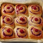 5. Fill and Shape Rolls: Spread the cooled raspberry filling evenly over the surface of the dough. Starting from the long side, roll the dough tightly into a log. Slice into 12 even rolls.